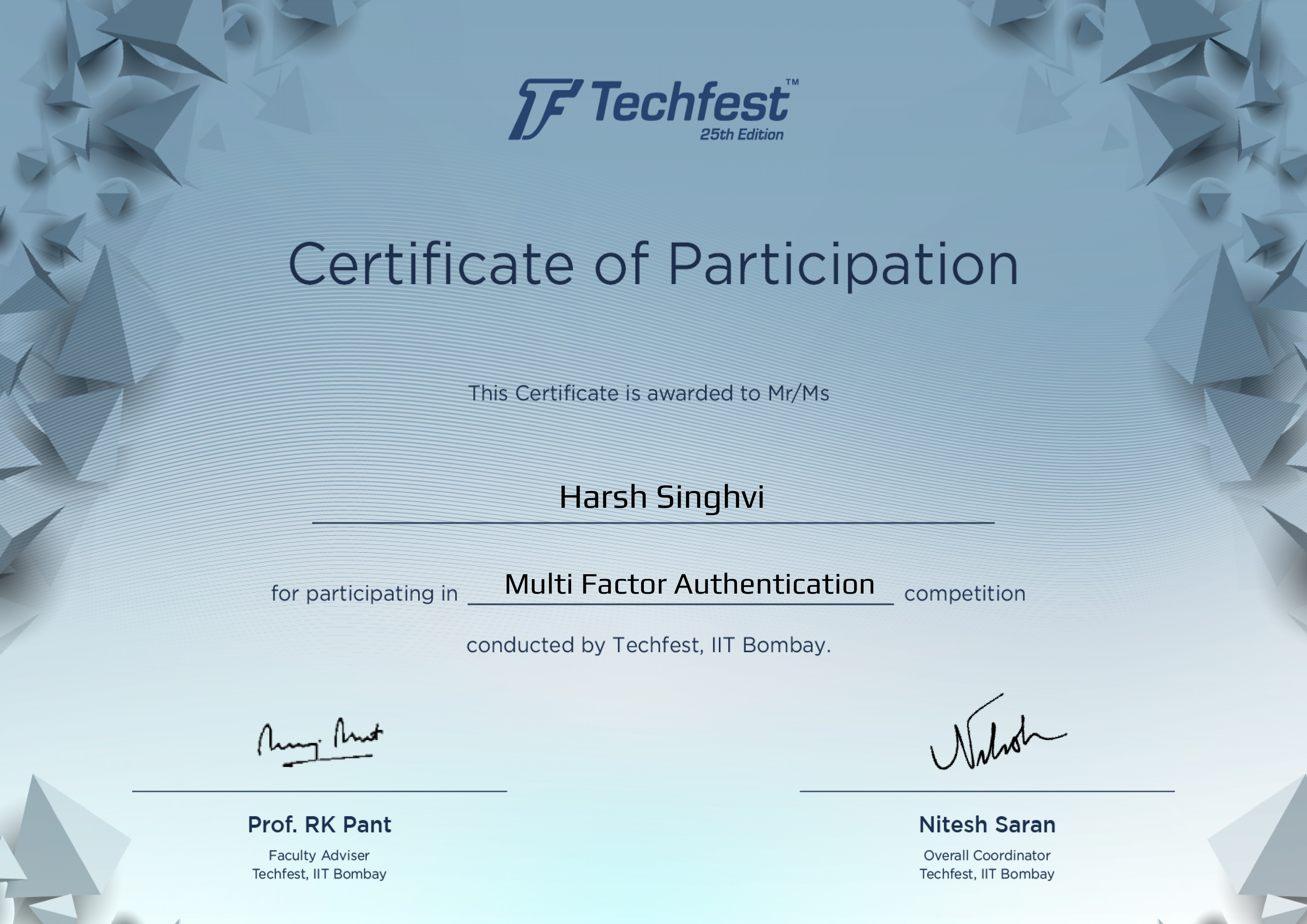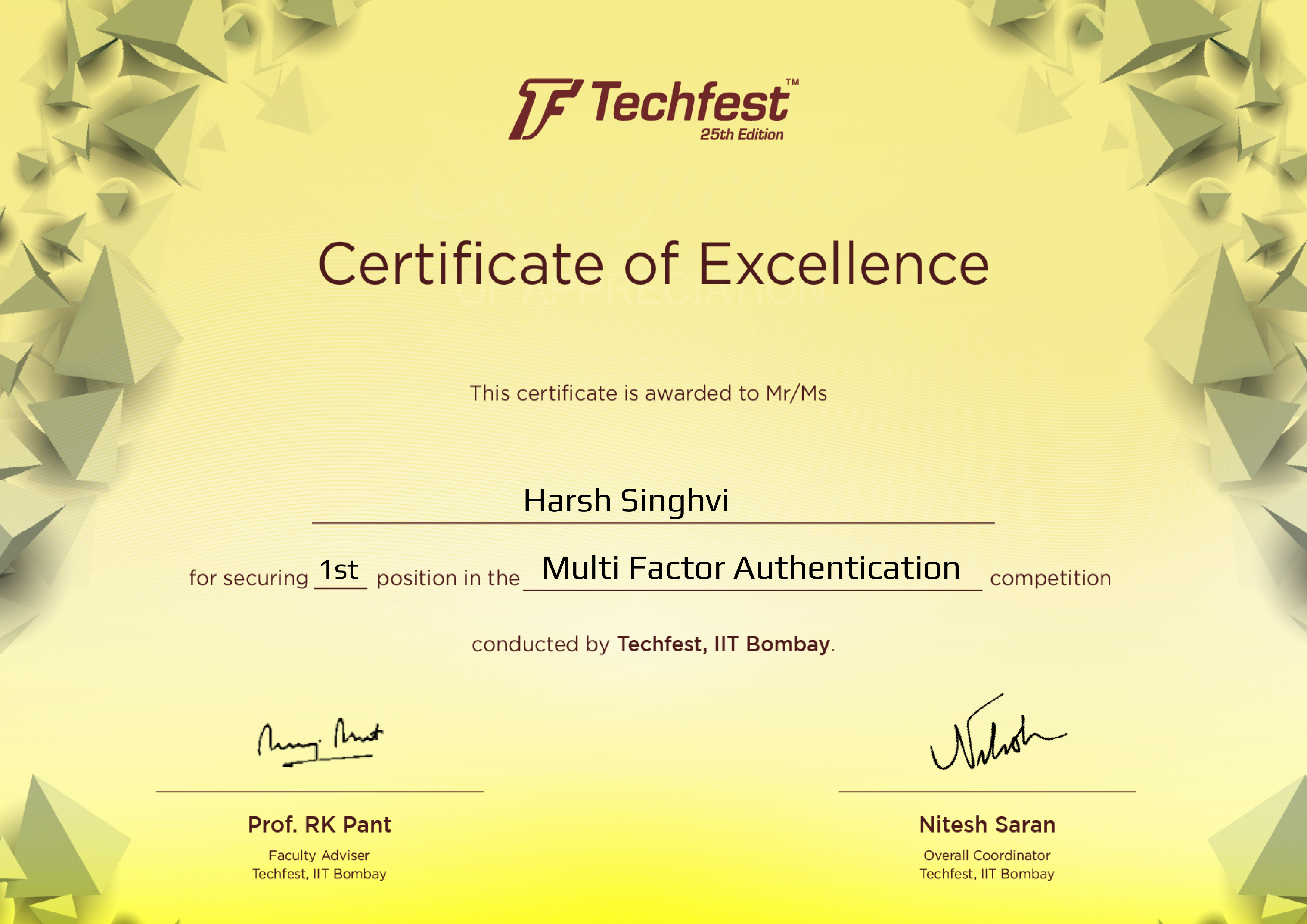 hackathon coding imp First Prize Winner IIT B Techfest Multi factor Authentication Hackathon by Harsh Singhvi Dec 17, 2021 Download PDF Verify 1 Verify 2 Previous Article 7th India International Science Festival Next Article Genesis 2.0