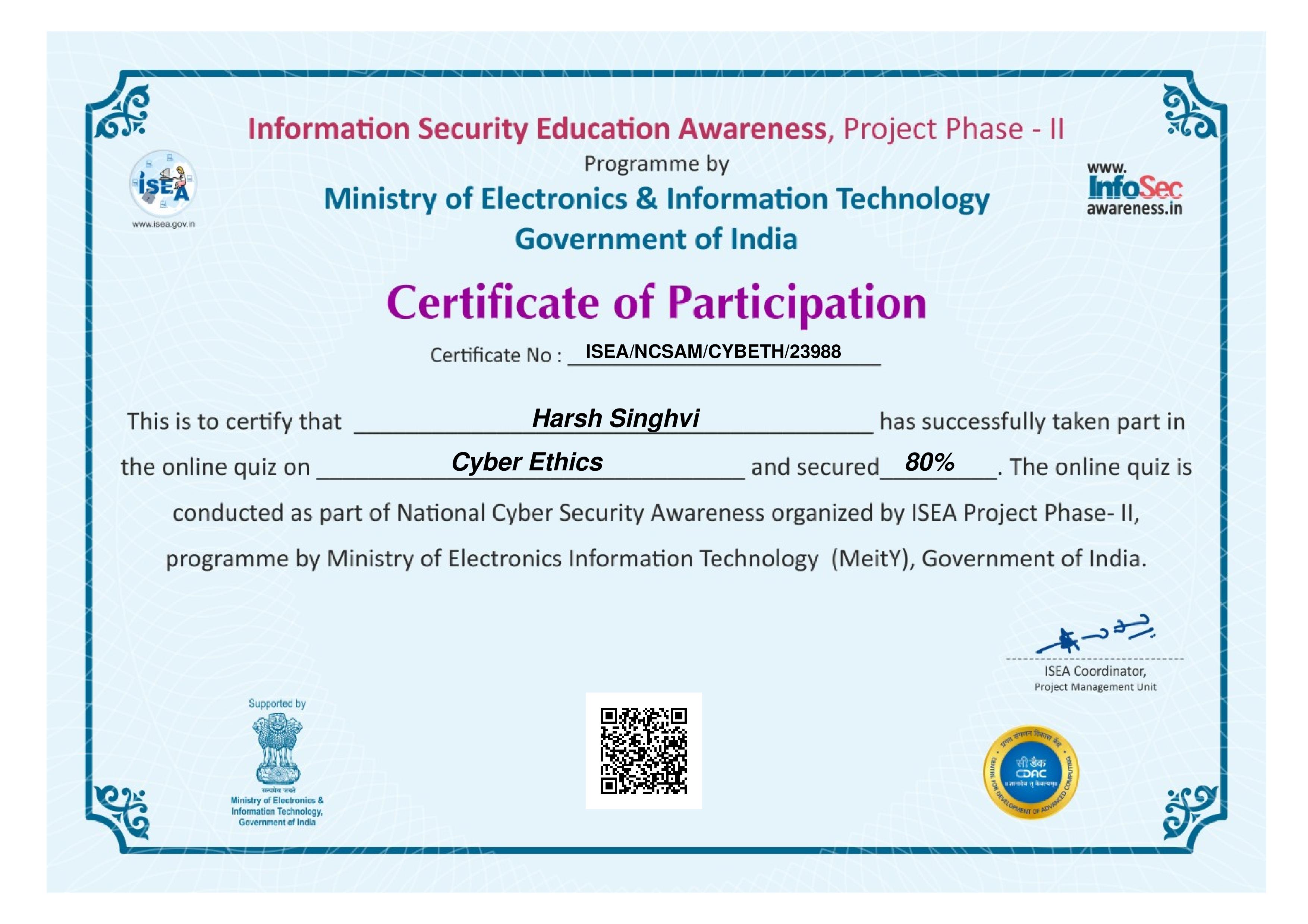 cyber Information Security Education Awareness Cyber Ethics Quiz by Harsh Singhvi Oct 20, 2020 Download PDF Certificate Number: ISEA/NCSAM/CYBETH/23988 Verify Certificate Previous Article Empowering the Brand 'YOU' on LinkedIn Next Article Information Security Education Awareness Password Security