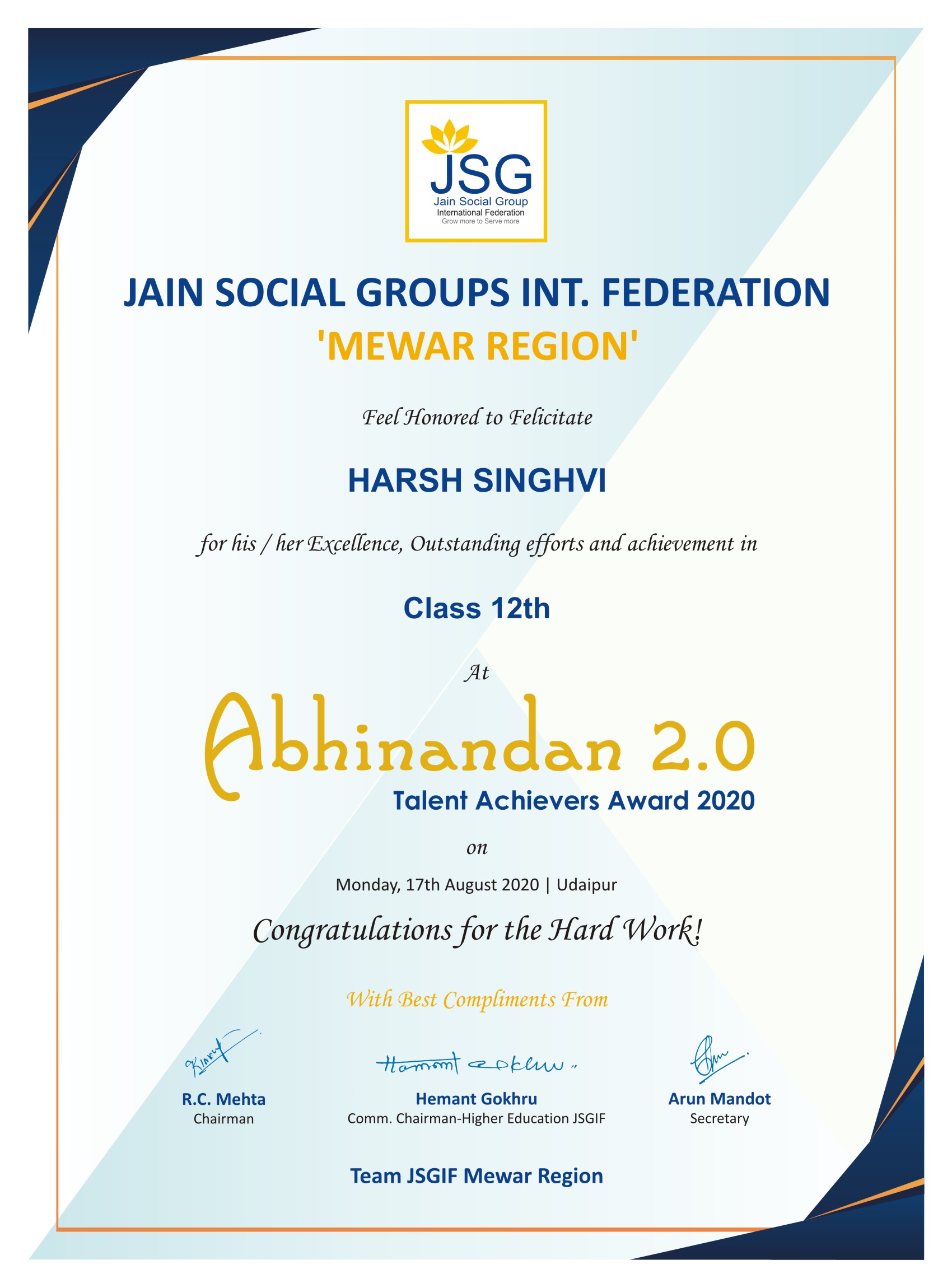 academics ABHINANDAN 2.0- Talent Achievers Award 2020 organised by JSGIF Mewar by Harsh Singhvi Aug 17, 2020 Download PDF Previous Article OSINT Mini Next Article Ethical Hacking Workshop By WAC with IIT-KGP
