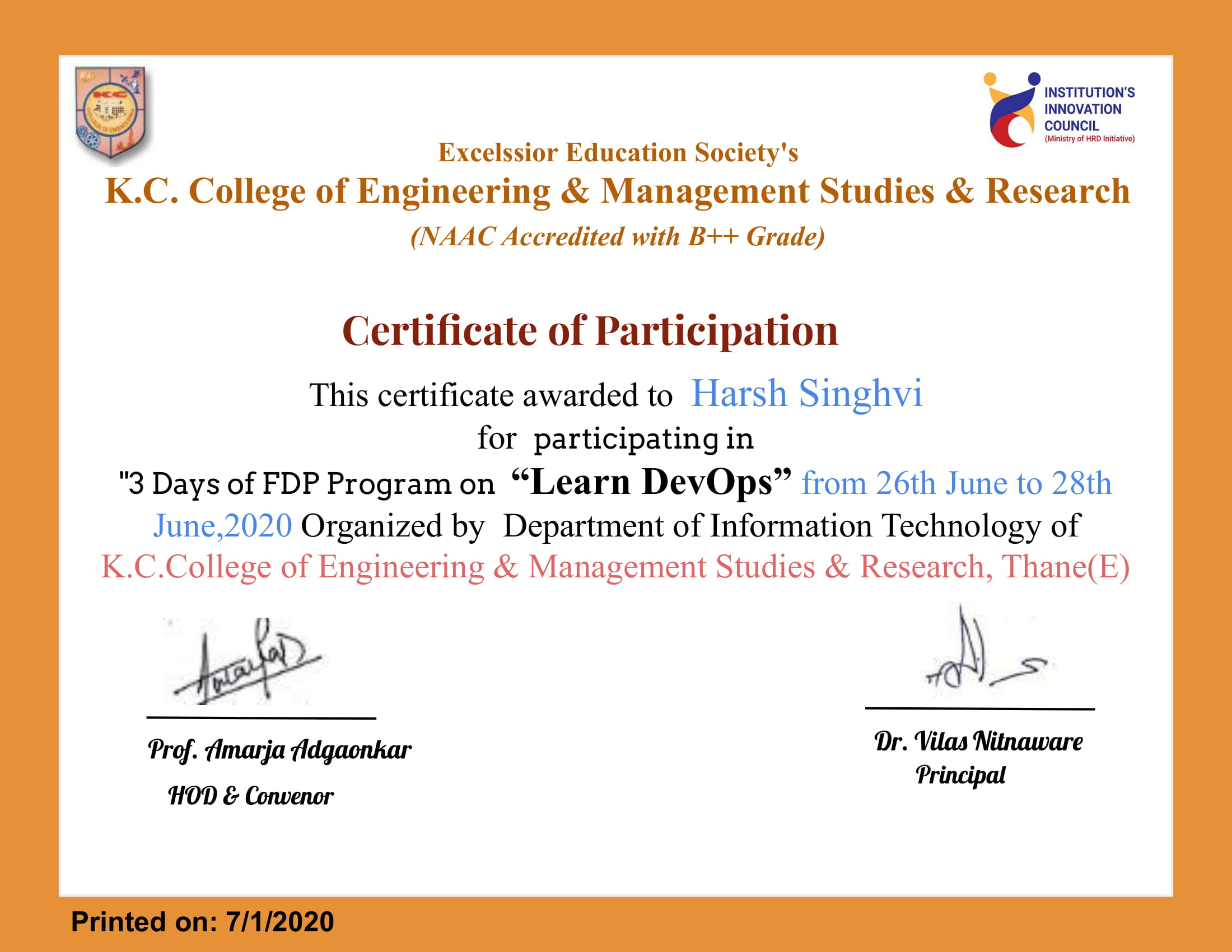 devops-it imp Learn DevOps by K.C. College of Engineering & Management Studies & Research by Harsh Singhvi Jul 01, 2020 Download PDF Certificate ID: ZUGZMC-CE000111 Previous Article We Are Plymouth's - STTP Program Next Article IMA Mumbai Chapter